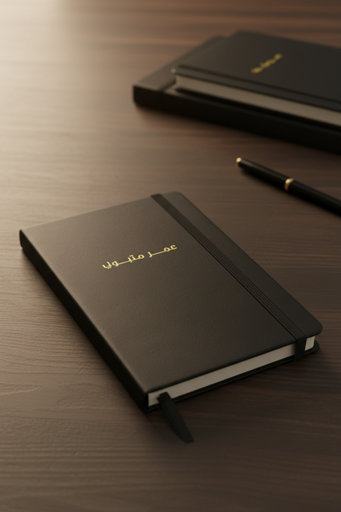مذكرة فاخرة مخصصة بالاسم – تصميم أسود بنقش ذهبي